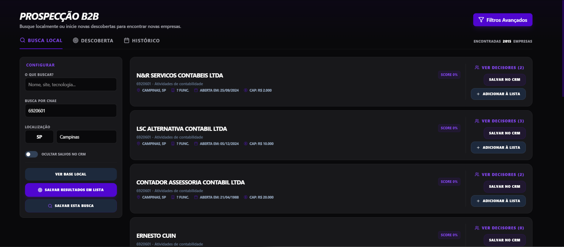 O Prospect CRM gera o que você ainda não tem — leads, decisores e negócios.