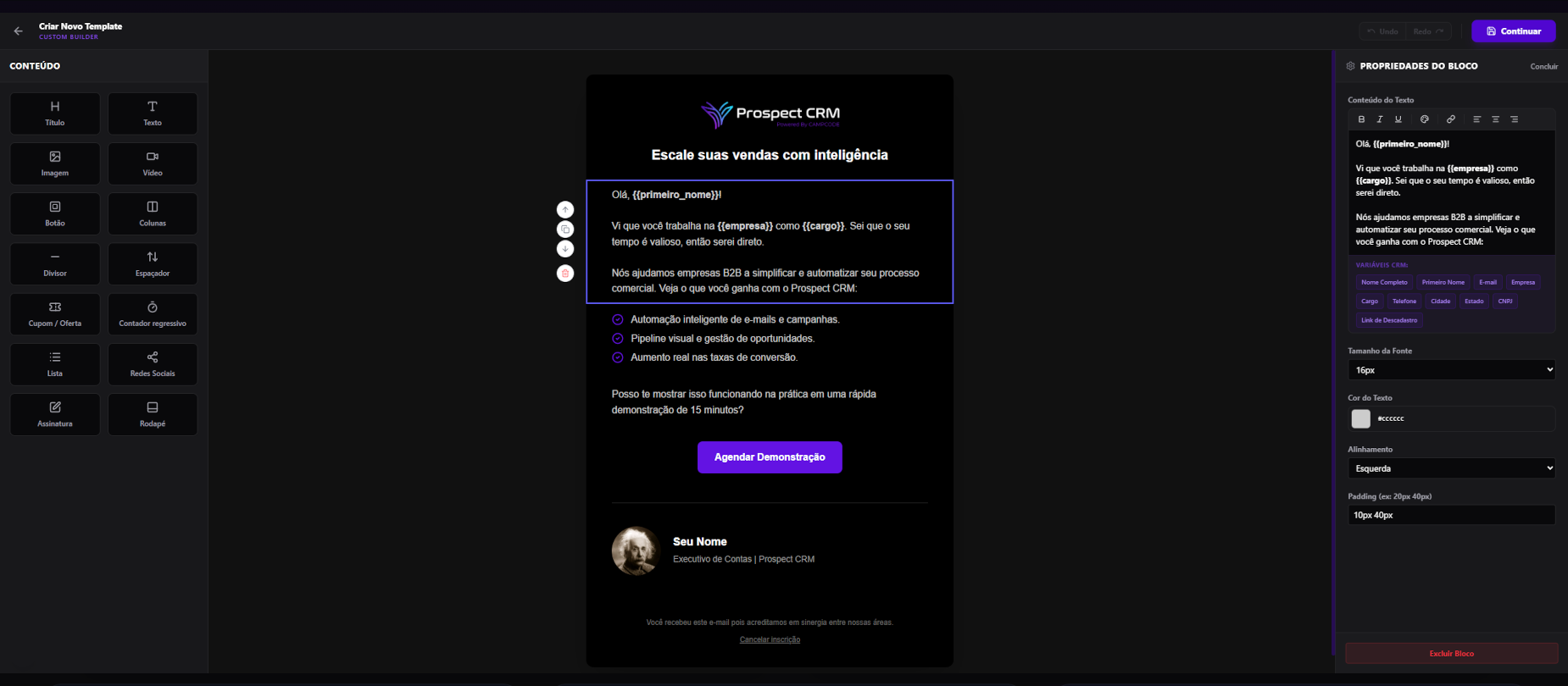O Prospect CRM tem um editor nativo com drag & drop completo. Arraste blocos, personalize cores, insira o nome do lead automaticamente e envie para milhares de contatos — direto do CRM, sem ferramentas externas.
