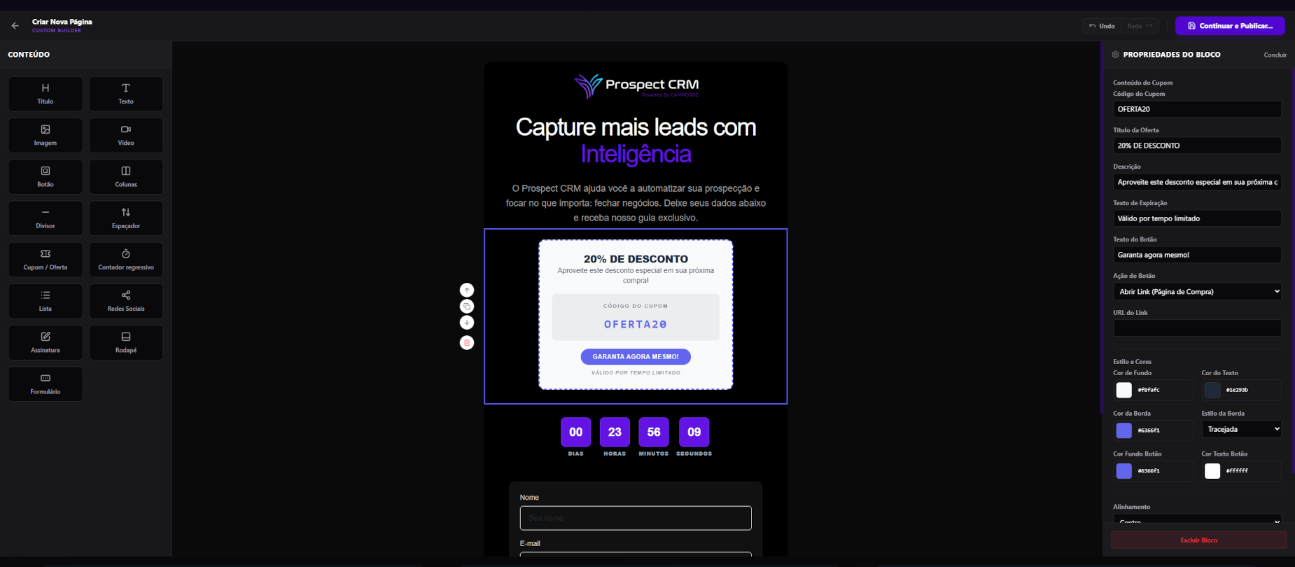 Adicione contadores regressivos e blocos de oferta para acelerar a decisão do lead e aumentar a conversão.