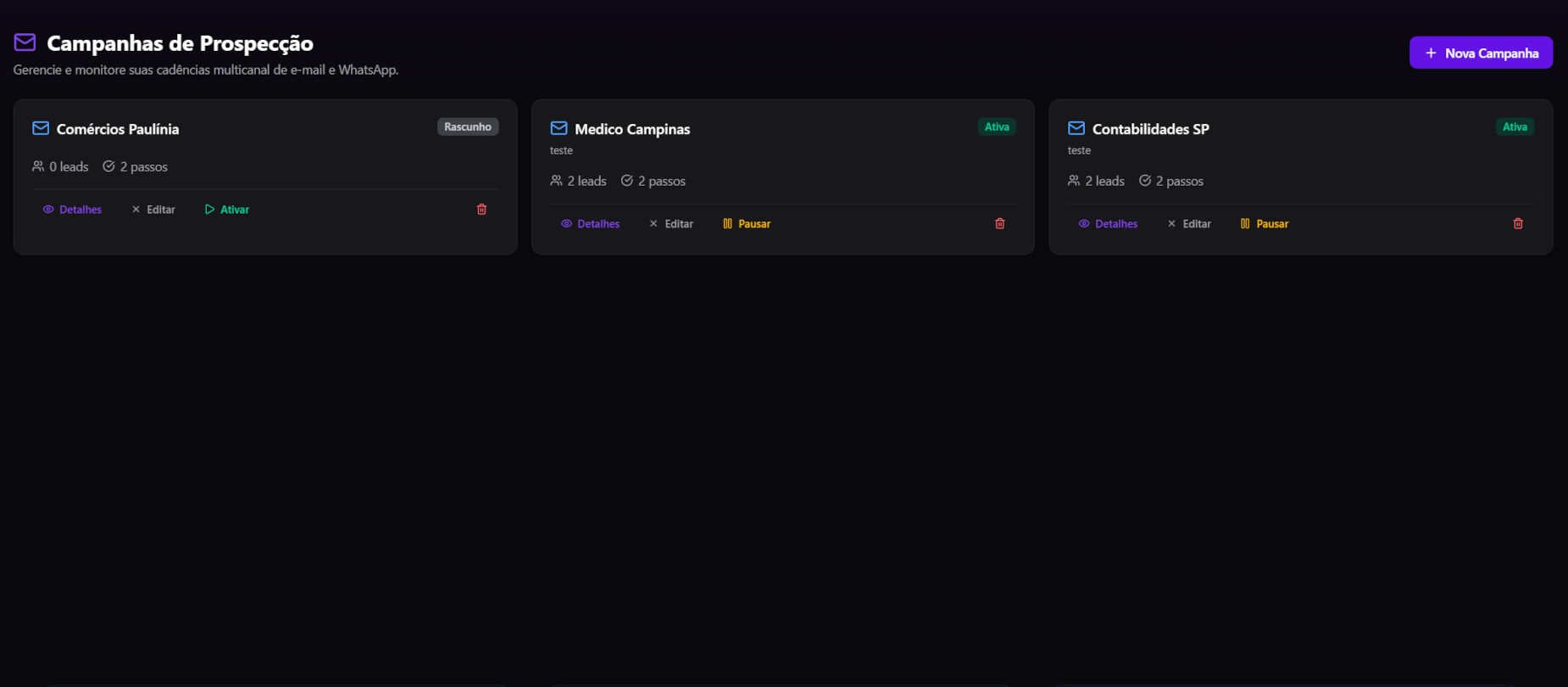 Cadências de E-mail e WhatsApp em uma única campanha. Tracking completo de abertura, clique e resposta.