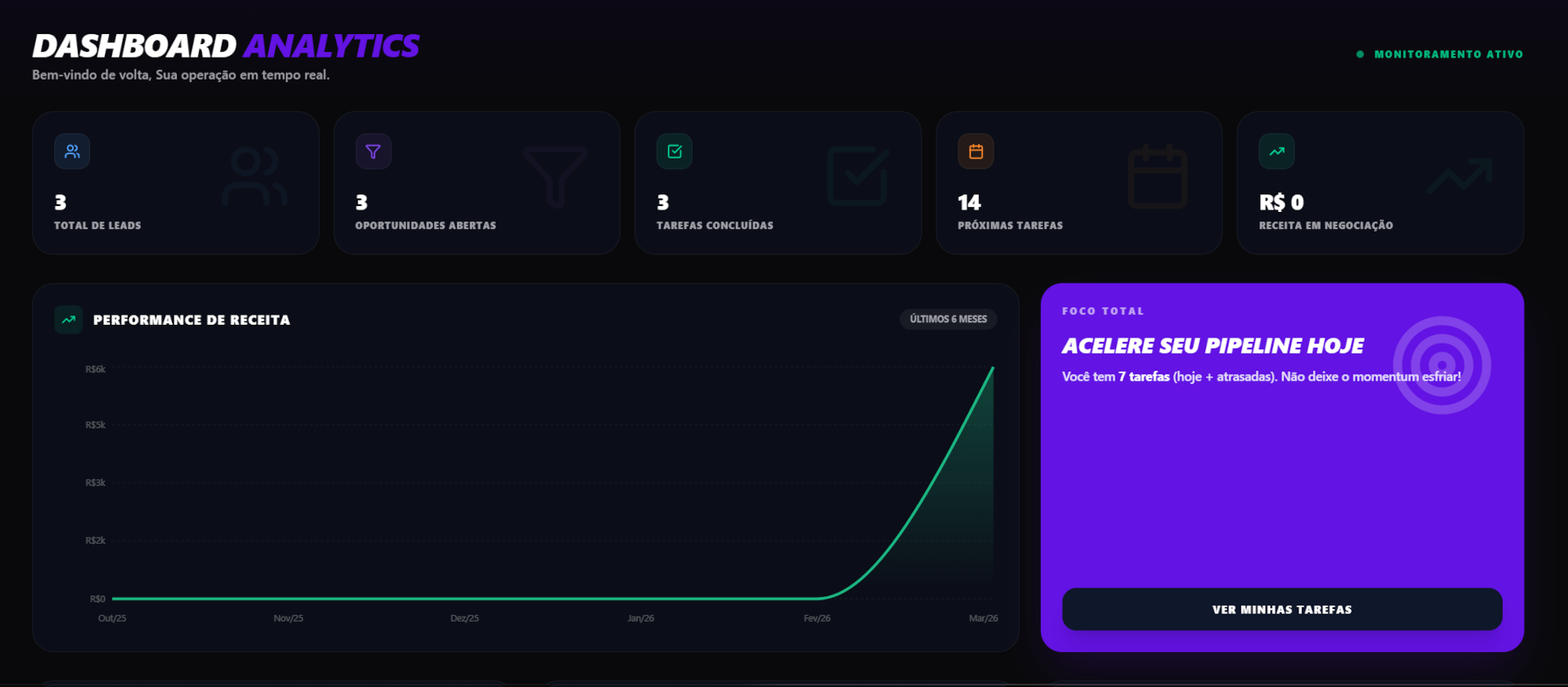 Métricas de receita, funil de vendas, saúde do pipeline e origem de leads em tempo real.